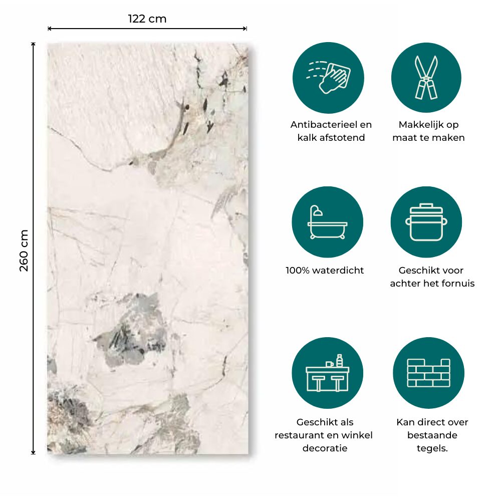 Met 100% waterbestendigheid zijn deze platen perfect voor badkamers of douches. Ze zijn slechts 3 mm dik en ideaal voor alle binnenruimtes. De wandpanelen zijn makkelijk op maat te maken en direct over bestaande tegels te plaatsen.