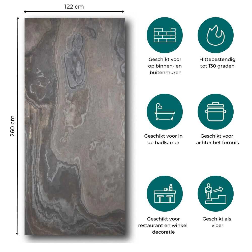 Prijs Per stuk, wandpaneel 260x122cm Montage Op maat maken met een Cirkelzaag of Decoupeerzaag. Monteren kan met Paneli Montagelijm Toplaag 100% Natuursteen Onderkant Glasvezeldoek + Polyester Weerbestendig Ja Geschikt voor in de Badkamer Ja Geschikt voor Buiten Ja Impregnatie Vereist bij vocht en vet Flexibel Ja Levering Speciaal Transport 3 tot 10 werkdagen